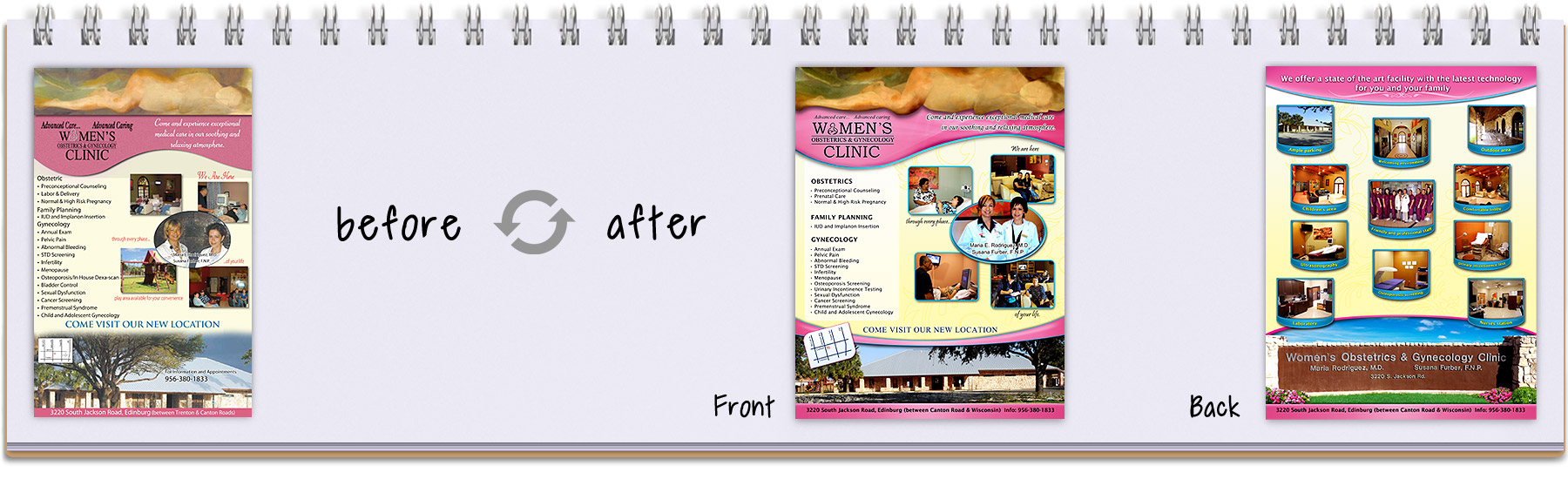 This flyer was made to announce business new location and to present it to the client's community, distributed to three cities, it had to portrait a friendly design that persuades to come in and meet the new location and services of Women's Obstetrics and Gynecology Clinic, one of the most important services for women located in the area of Rio Grande Valley, Texas. The project was already designed by other agency but it didn't show a design that could achieve those purposes, neither reached the client's expectations according to her specifications. So I was invited to participate in this project and I was asked to present a design that could improve the existed one. The main indication was that I had to leave the design how it was, without drastic changes, but making it better.
