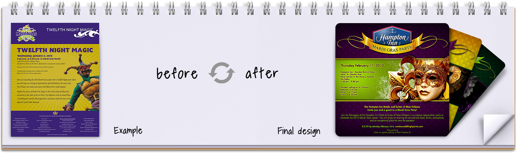 Ernesto created an invite for the Mardi Gras Client Appreciation Party thrown by the Hampton Inn & Suites of New Orleans in 2010. The company needed an invitation that portrayed the spirit of Mardi Gras and that elicited the corporate clients to attend the party. The color scheme and the masquerade picture he used were perfect for the invitation and we were very impressed with the invite and his talent.”